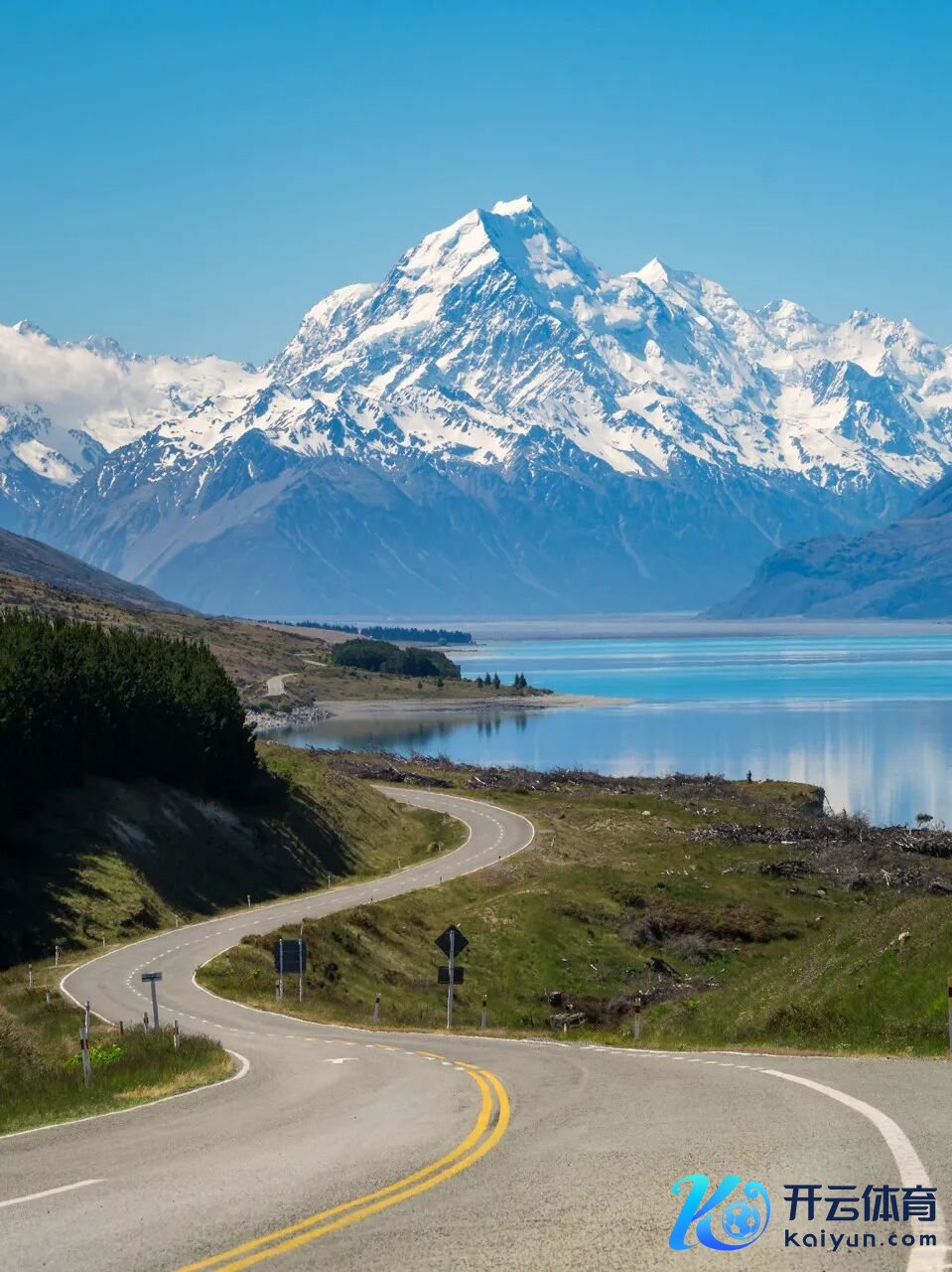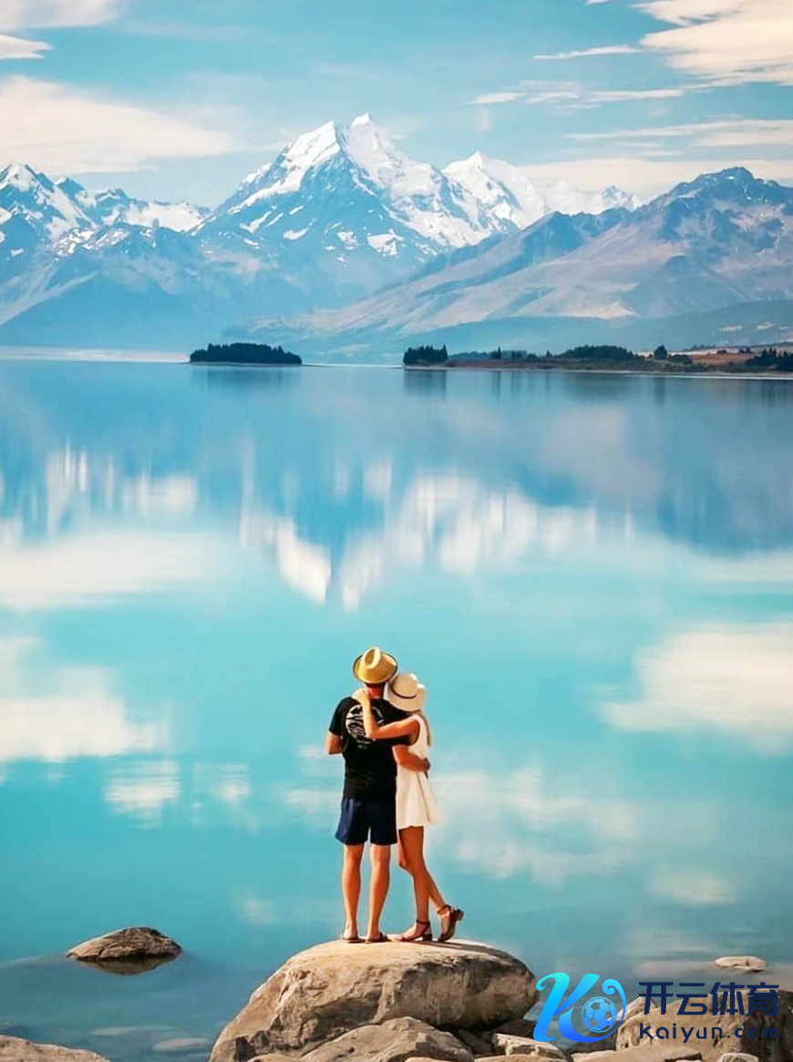 不远方的库克山,是新西兰的最岑岭,山顶的积雪与山脚的草原、湖泊交汇在沿途,档次分明。