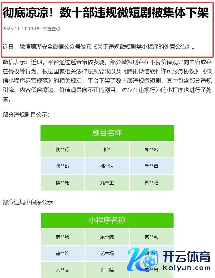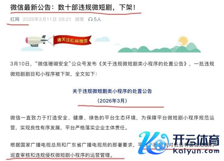 与此同期,“红网”官方亦发布专项告示:微信生态内数十部违章微短剧已所有关停,并升级时期审核机制,强化对涉未成年东说念主无益内容、版权侵权及价值不雅偏差类作品的识别与羁系才略。