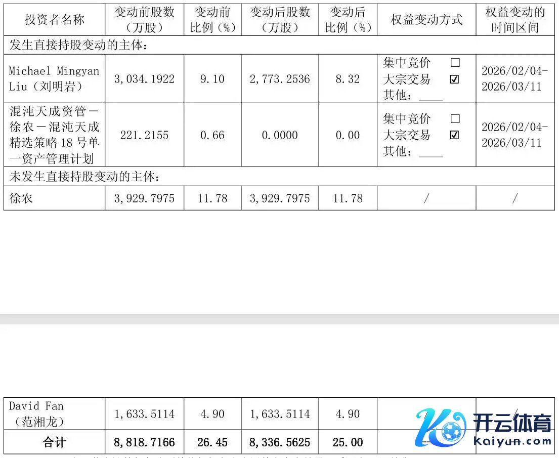 3月12日,三友医疗(688085)公告,近日,公司收到MichaelMingyan Liu(刘明岩)先生及徐农先生出具的《奉告函》开云体育,2026年2月4日至2026年3 月11日,MichaelMingyanLiu(刘明岩)先生通过大量交游状貌揣摸减握公司股份2,609,386股,占公司总股本的0.78%;徐农先生的一致步履东谈主迁延天成18号通过大量交游状貌揣摸减握公司股份2,212,155股,占公司总股本的0.66%。